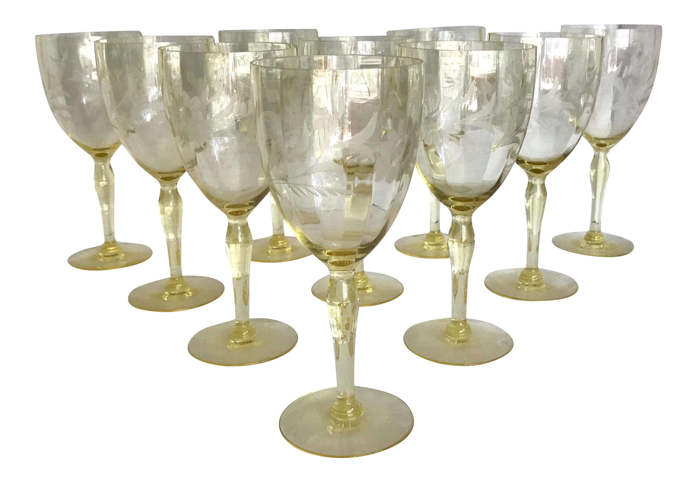 1930 S Set Of 10 Depression Era Etched Yellow Goblet Glasses Chairish
